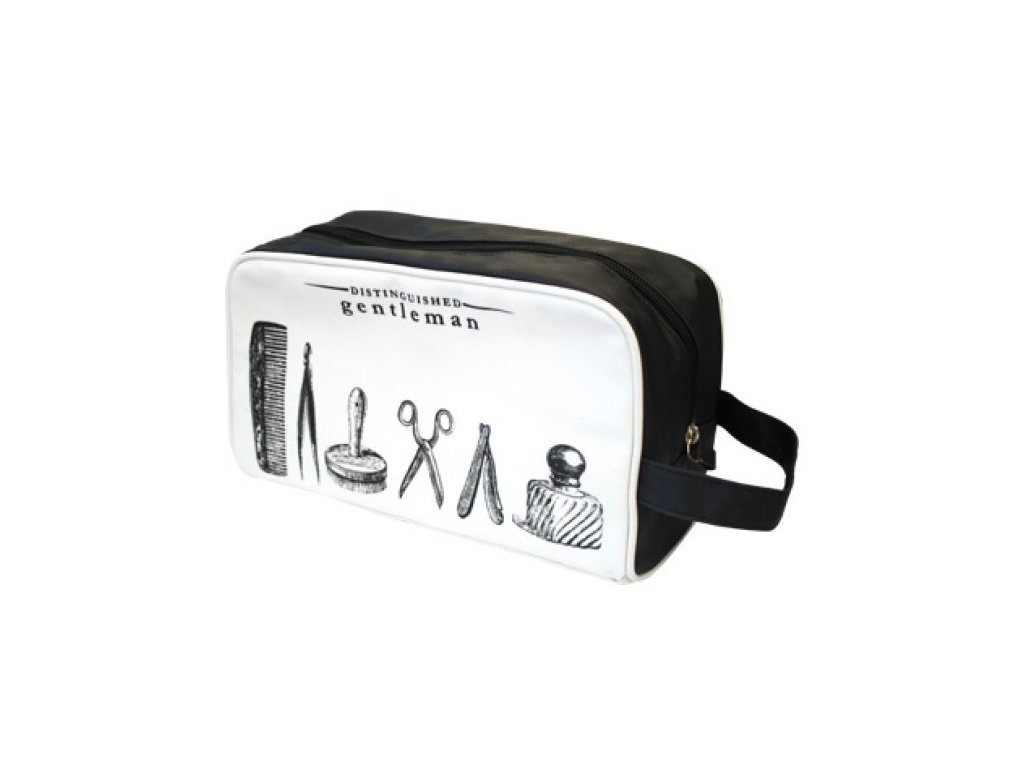 Takovou toaletní tašku by Vám záviděl lecjaký britský gentleman z viktoriánského období. Univerzální černo-bílé provedení se bude hodit ke všemu, díky potažení PVC se neušpiní, na přední straně jsou vyobrazené mimo jiné parfém, štětka na holení a břitva, které Vás v myšlenkách přenesou do salónů, ve kterých si nechávali upravit svůj vous praví gentlemani a zip uchrání všechny Vaše toaletní potřeby.